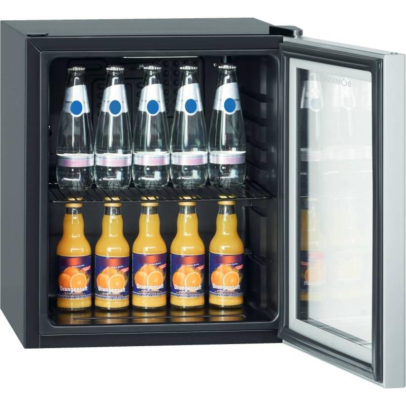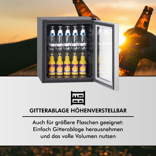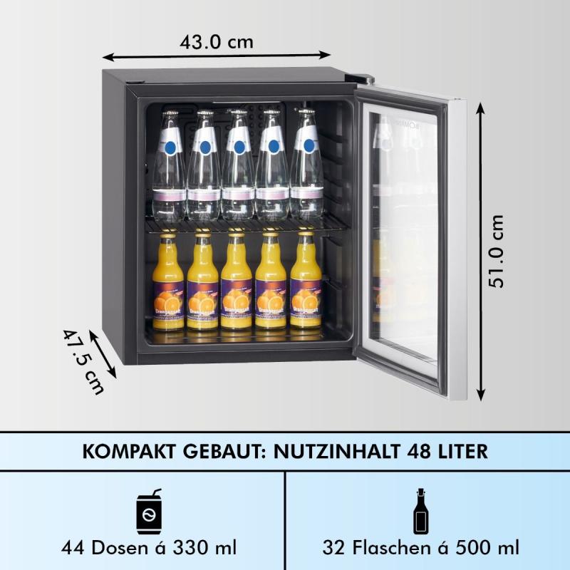 Der KSG 7282.1 von Bomann hat einen Nutzinhalt von 48 Litern und ist ca. 51 x 43 x 47,5 cm (BxHxT) groß. Dank der herausnehmbaren, höhenverstellbaren Gitterablage steht Ihnen bei Bedarf das gesamte Volumen des Kühlschrankes zur Verfügung. Mit Hilfe des stufenlos regulierbaren Thermostats können Sie die Temperatur individuell nach Ihren Bedürfnissen einstellen. Zusätzlich verfügt das Kühlgerät über eine effiziente, separat schaltbare LED-Innenraumbeleuchtung und eine doppelverglaste Tür.