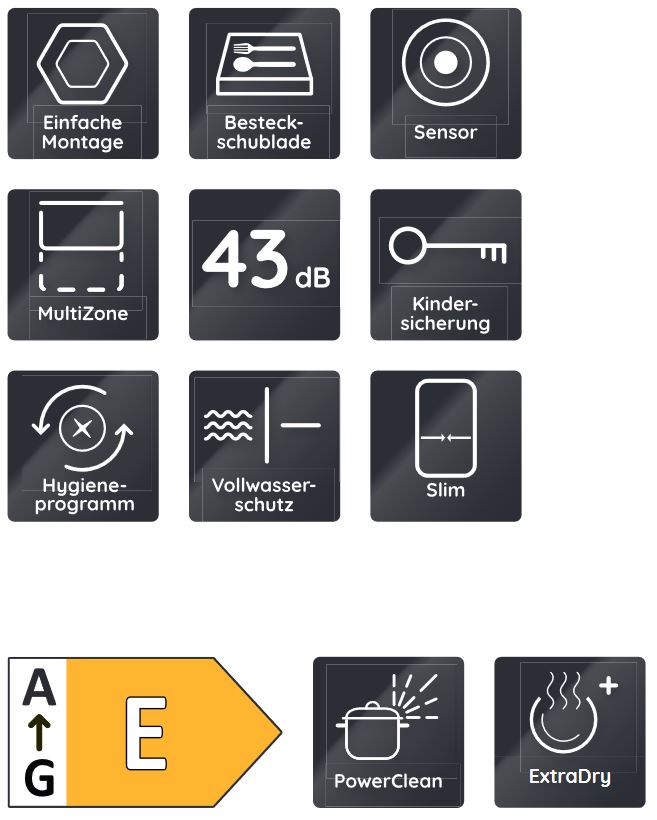 - Spülprogramme: ECO, Kalt Vorspülen, Sensorprogramm, Expressprogramm, Intensivprogramm, Glasprogramm, Hygieneprogramm, Schnelles Spülen & Trocknen