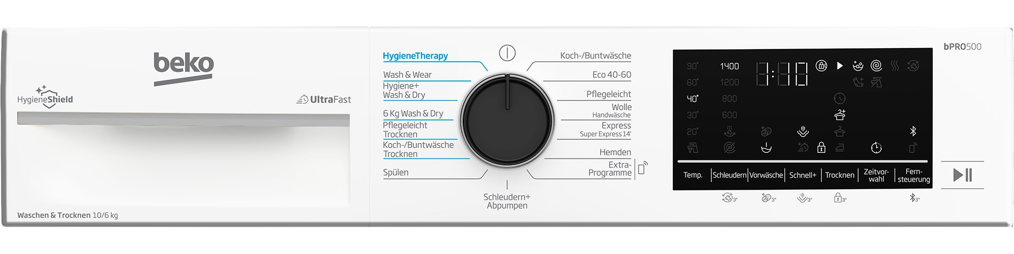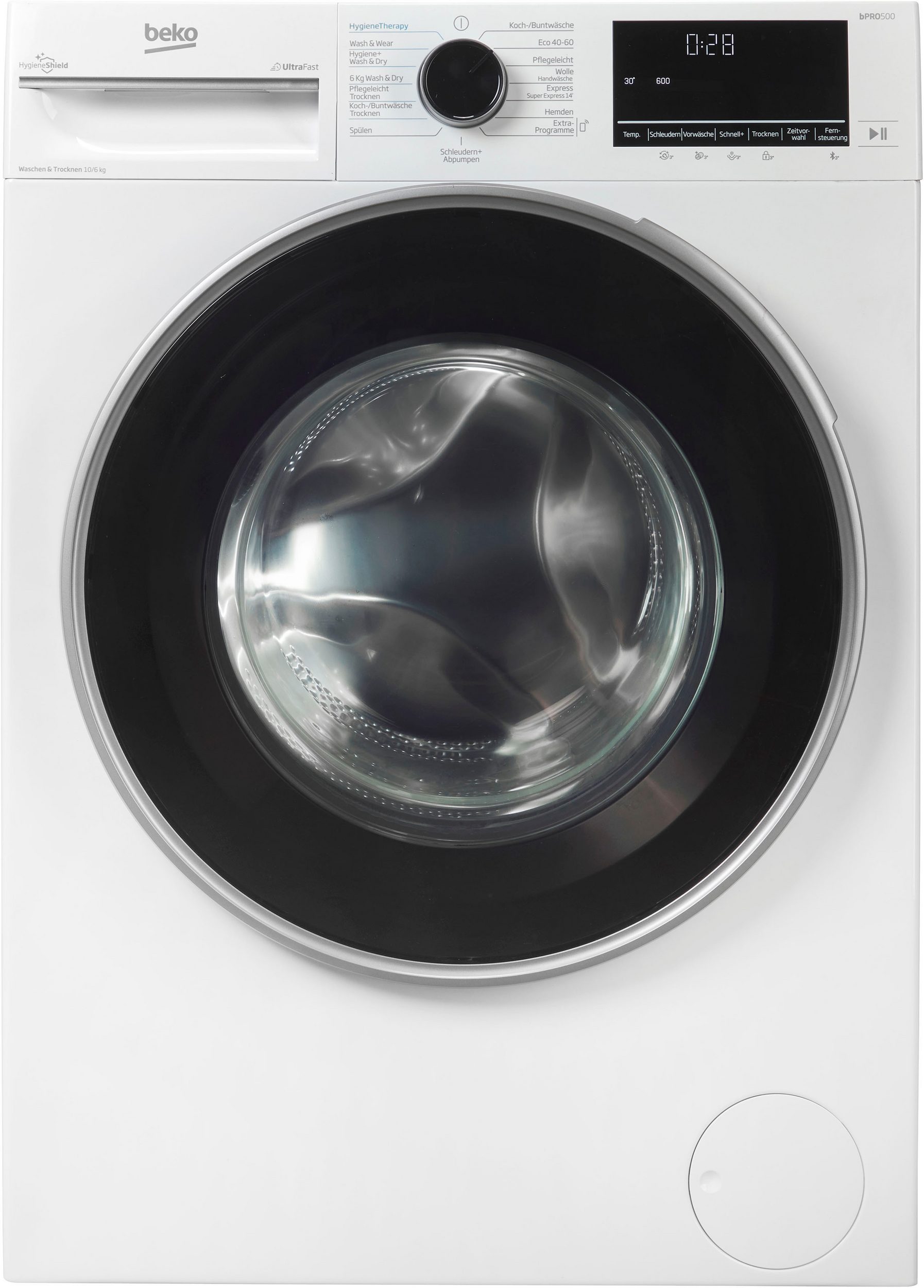 - Der Beko B3DFT510447W Waschtrockner ist ein freistehendes, leistungsstarkes Gerät, das das Waschen und Trocknen in einem einzigen Vorgang vereint. Er bietet eine 10-kg Waschkapazität und eine 6-kg Trocknungskapazität, was ihn ideal für große Haushalte macht.