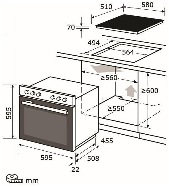 - Nischenmaß min. HxBxT 60,0 x 56,4 x 55,0 cm