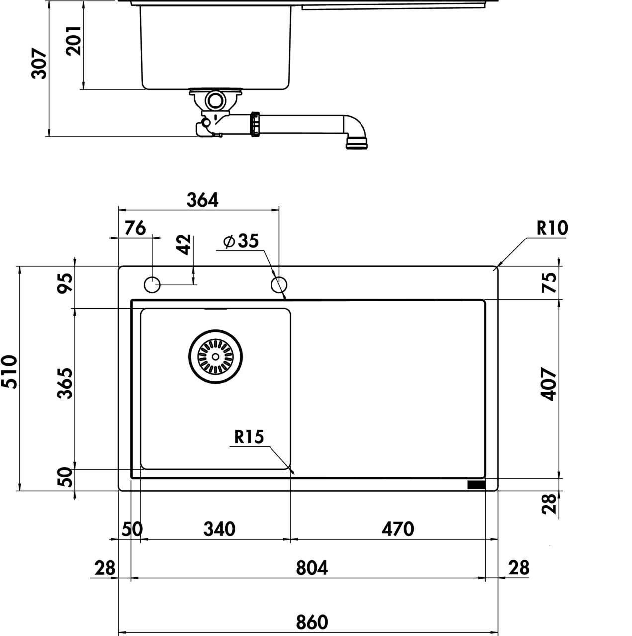 Spülenaußenradius (R): 10