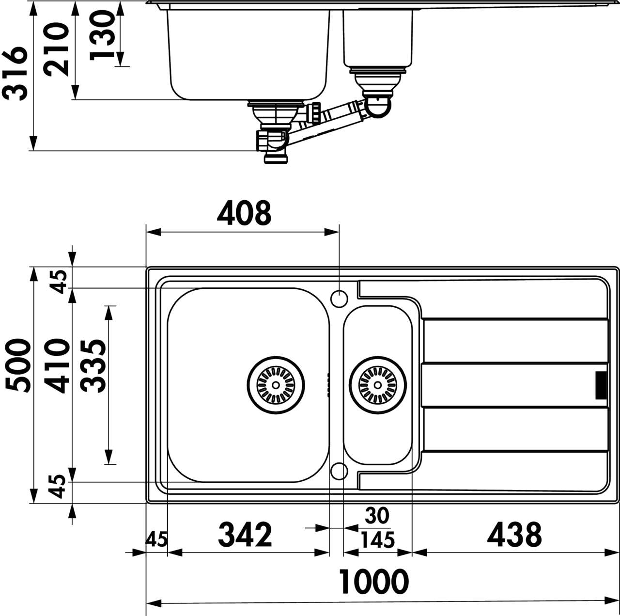 Tiefe Restebecken: 335 mm